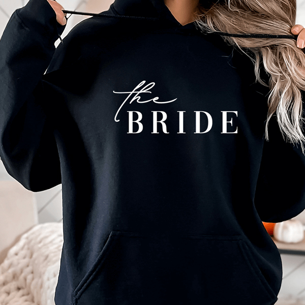 Printed The Bride on our luxury garment. Printed on high quality AWDs products in a range of sizes. Printed on evolution print which makes them vegan friendly too.