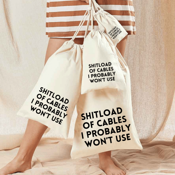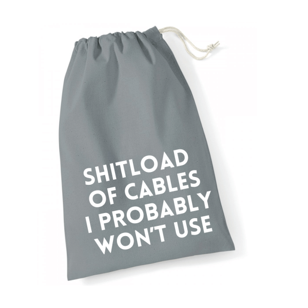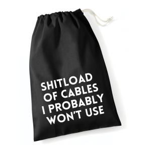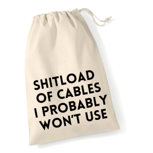 Funny and a great gift to give someone who has cables everywhere! Heat pressed onto a cotton bag with text saying ‘Shit load of cables I probably won’t use’.