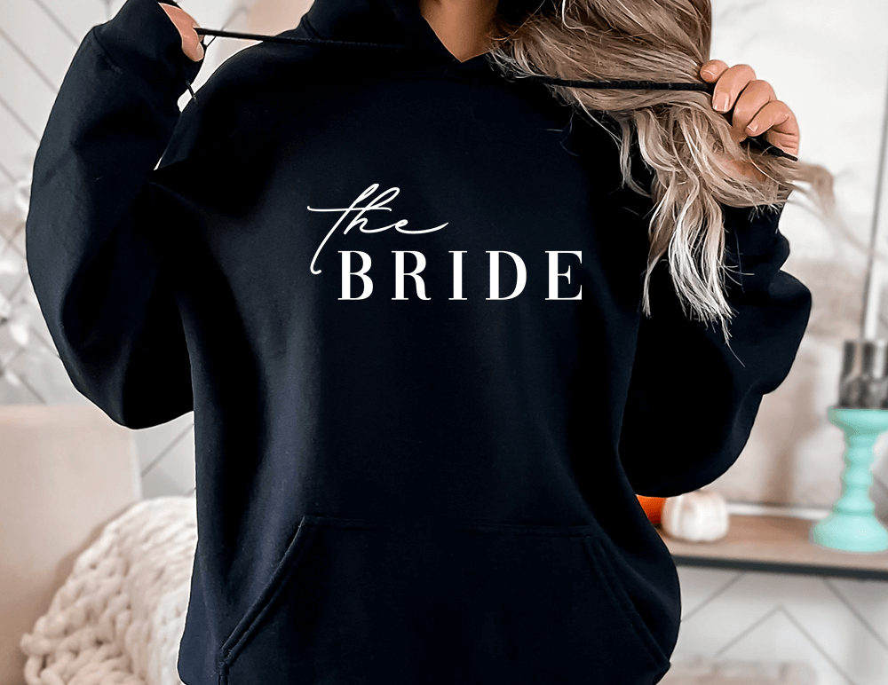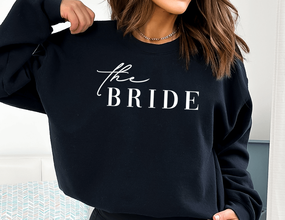 Printed The Bride on our luxury garment. Printed on high quality AWDs products in a range of sizes. Printed on evolution print which makes them vegan friendly too.