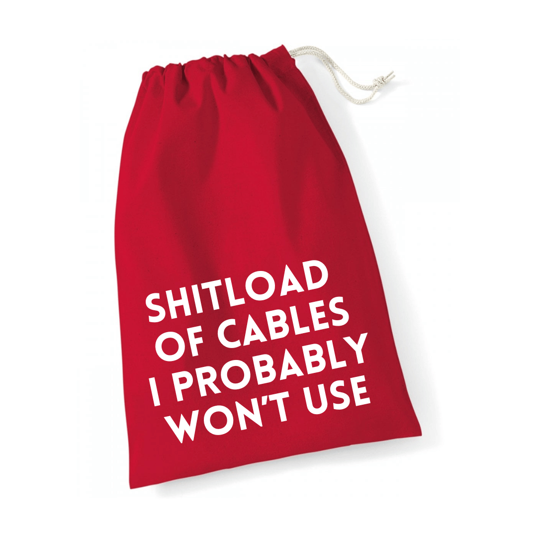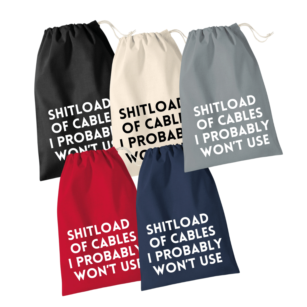 Funny and a great gift to give someone who has cables everywhere! Heat pressed onto a cotton bag with text saying ‘Shit load of cables I probably won’t use’.